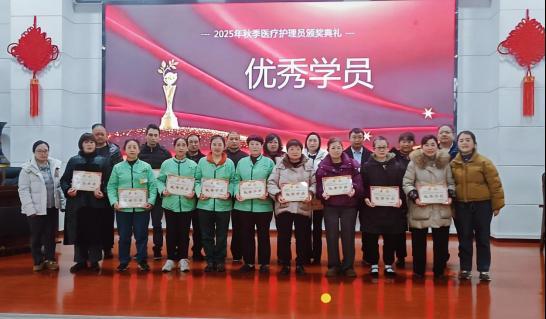 2026年1月13日下午,我院护理部在学术报告厅举行2025级医疗护理员培训总结暨表彰会,科护士长吴丹出席会议并为通过考核的优秀学员颁奖。