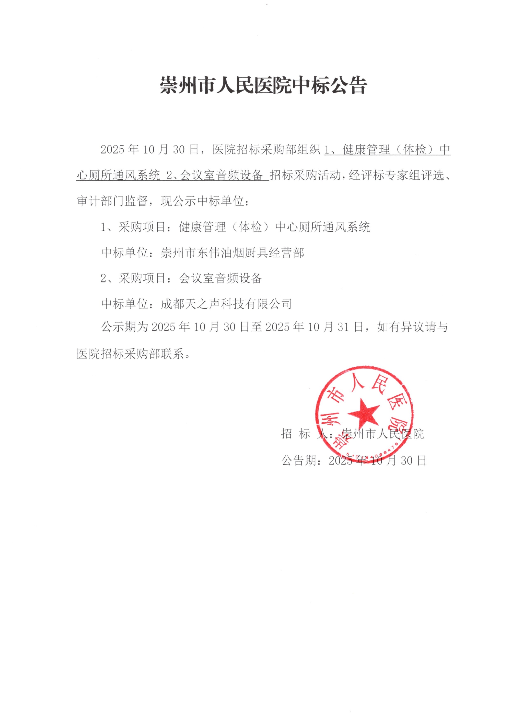 崇州市人民医院院内采购项目中标公告