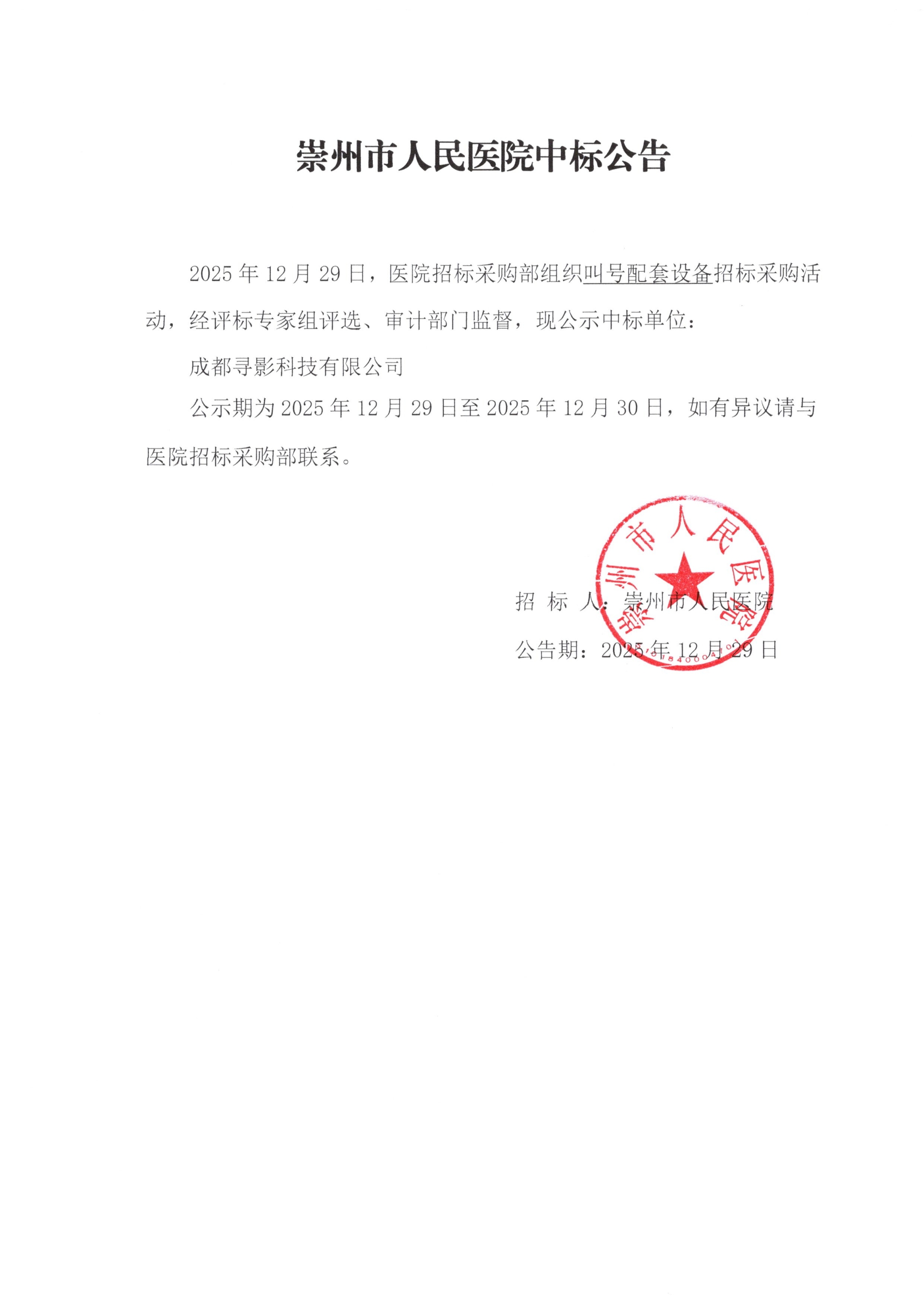 崇州市人民医院院内采购项目中标公告
