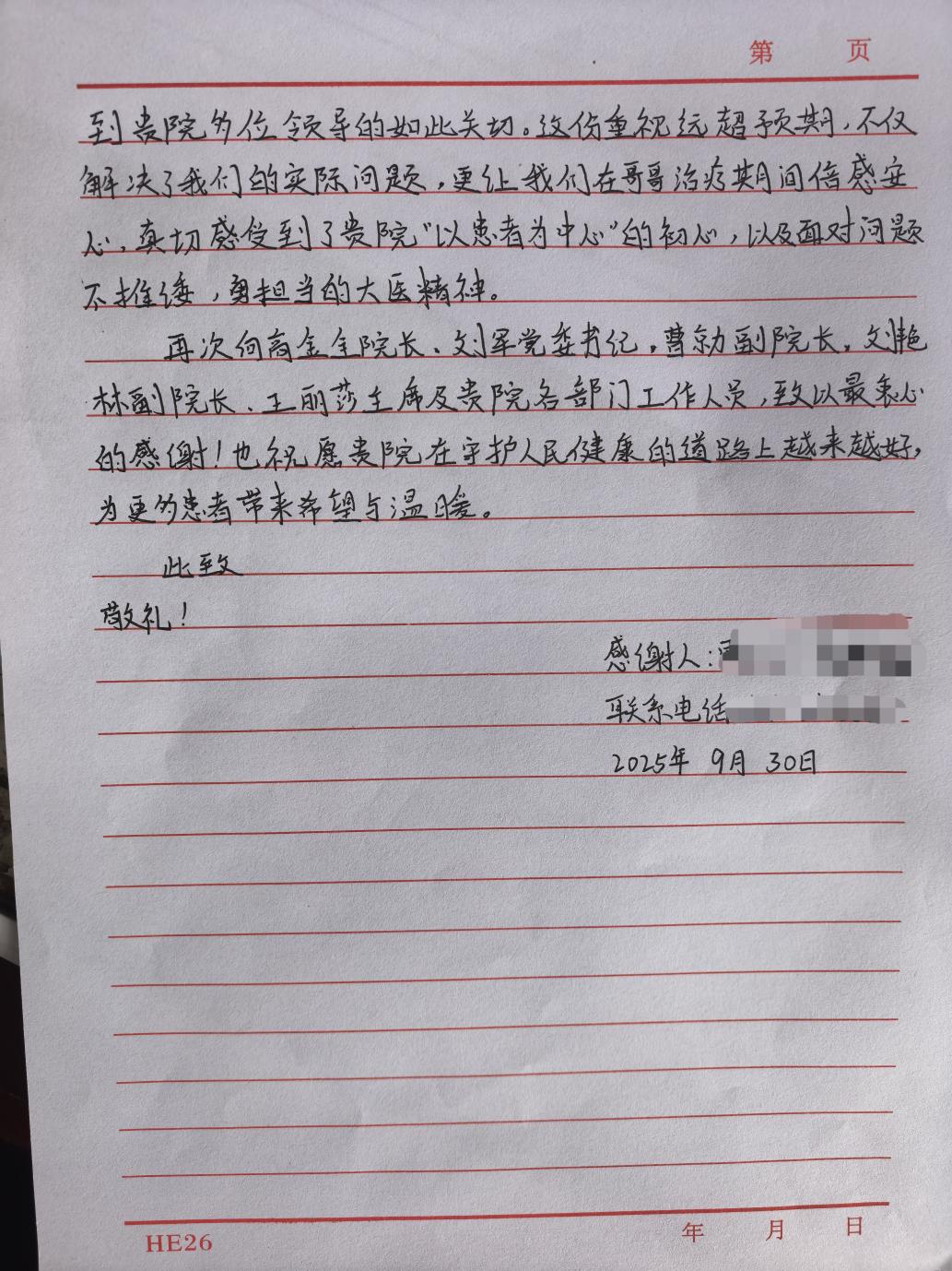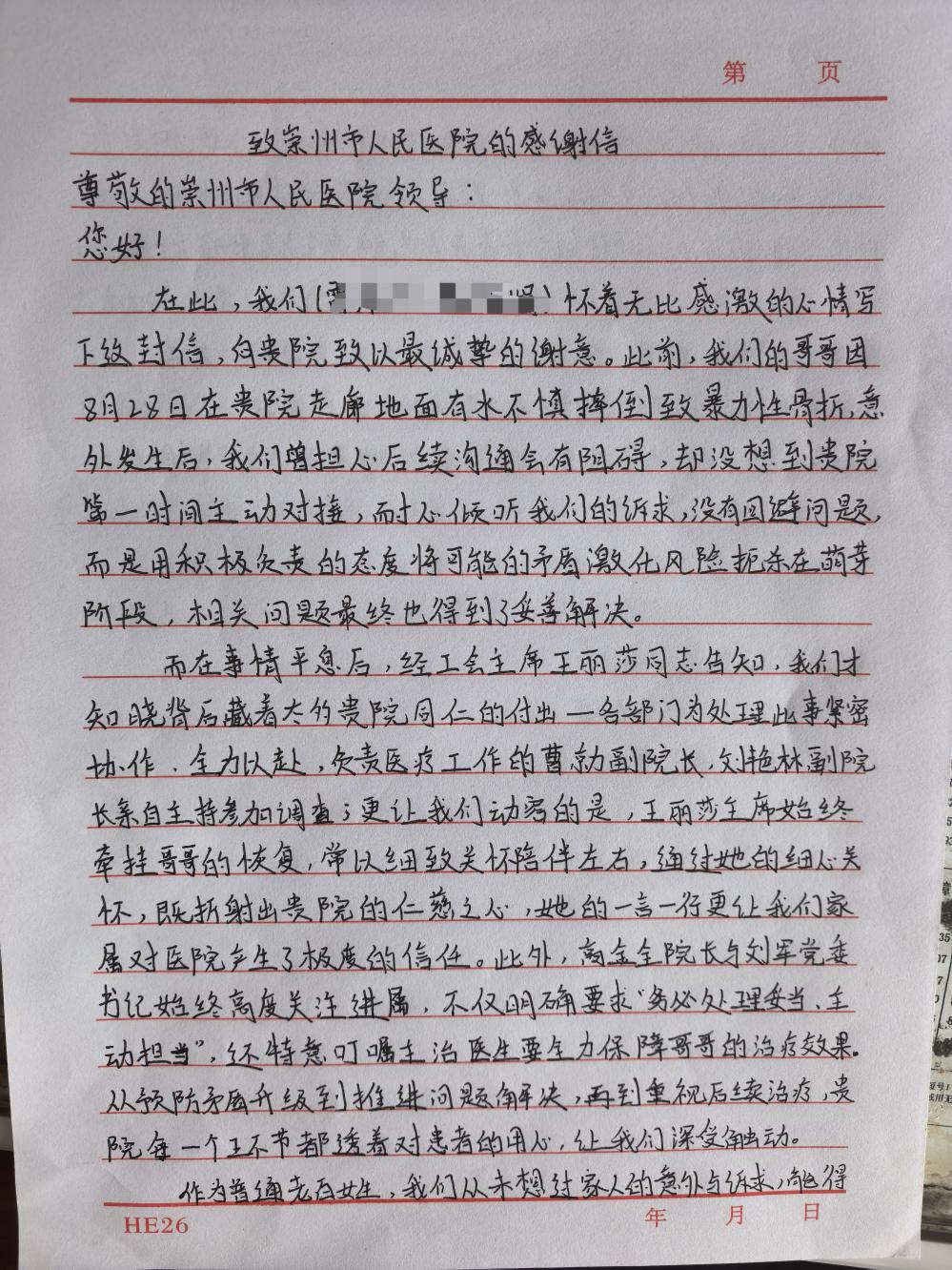 “作为普通老百姓,从没想过家人的意外和诉求,能得到医院这么多领导的关切!”雷女士在信中表示,最初因哥哥在医院意外滑倒骨折而心怀愤懑,甚至做好了“背水一战”的维权准备,担心医院会推诿责任。然而,崇州市人民医院的主动担当彻底扭转了这一局面——从院领导亲自督办调查、工会主席多次探望,到医护团队全力保障治疗,医院的每一份诚意都击碎了家属的疑虑。最终,雷女士对医院的担当心怀感动,提笔写下一封真挚的感谢信,字里行间满是对医院直面问题、勇担责任的敬佩与感激。医院的重视与关怀远超预期,不仅切实解决了实际问题,更让他们在患者治疗期间倍感安心,真切感受到了崇州市人民医院“以患者为中心”的服务初心,以及面对问题不推诿、勇担责的大医精神。