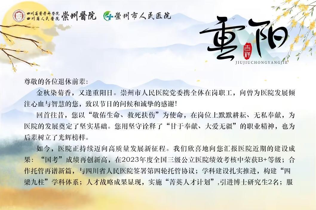 离退休职工是医院发展亲历者、建设者,更是宝贵财富。此次重阳节慰问活动,不仅让离退休老同志们深切感受到医院的温暖与关怀,更搭建起医院与老职工之间沟通的桥梁,进一步凝聚了“爱院如家”的向心力。未来,医院将持续做好离退休老同志的服务保障工作,用心用情解决他们的实际需求,让老同志们能够老有所养、老有所医、老有所乐、老有所为,与全院职工共享医院高质量发展成果,共同续写医院发展新篇章。