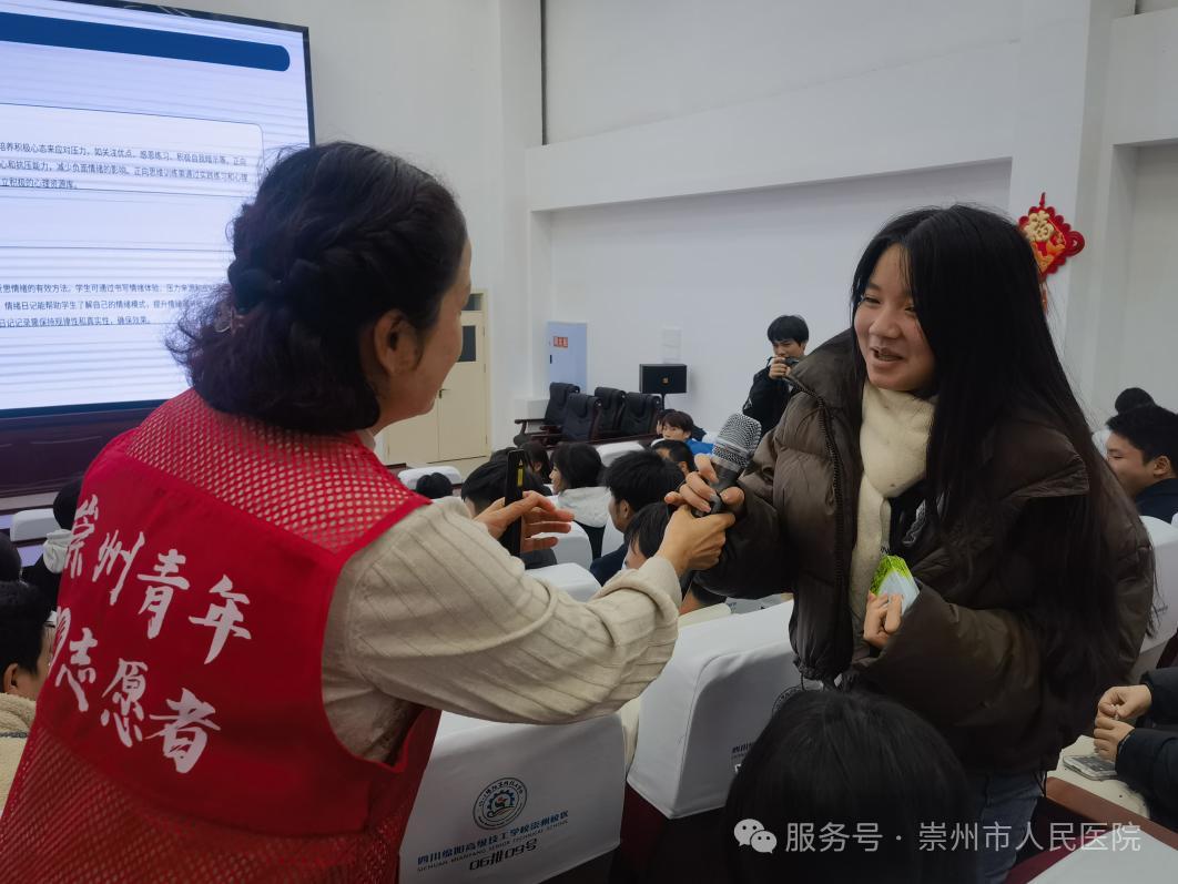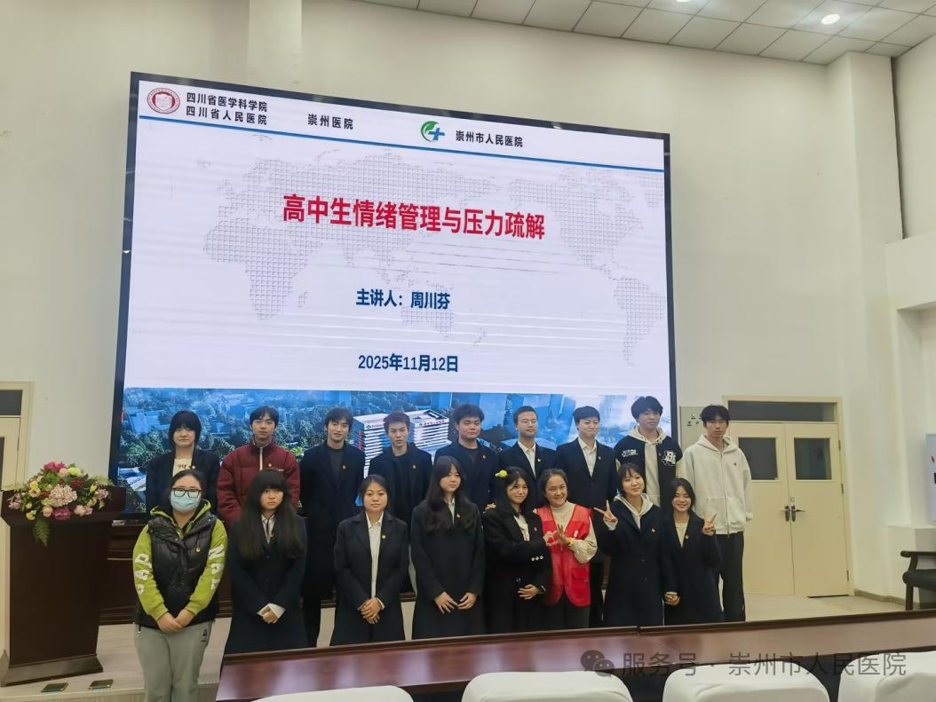 为积极响应青少年心理健康教育需求,助力高中生构建积极心态、提升情绪管理能力与心理韧性,11月12日由共青团崇州市委指导,我院团委联合崇州市青年志愿者协会共建的青年夜校心理课堂正式开讲。活动聚焦四川绵阳高级技工学校(崇州校区)学子心理健康需求,以“情绪管理与压力疏解”为主题,为高中阶段学子送上专业心理关爱。