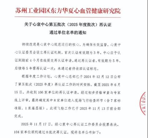 近日,一则振奋人心的消息从苏州工业园区华夏心血管健康研究院心衰中心认证工作委员会传来--崇州市人民医院心血管内科心衰中心成功通过2025年度国家标准版心衰中心的再认证。这一荣誉的取得,不仅是对医院心衰中心专业实力的高度认可,更是对全体医护人员辛勤付出的深情回馈。
