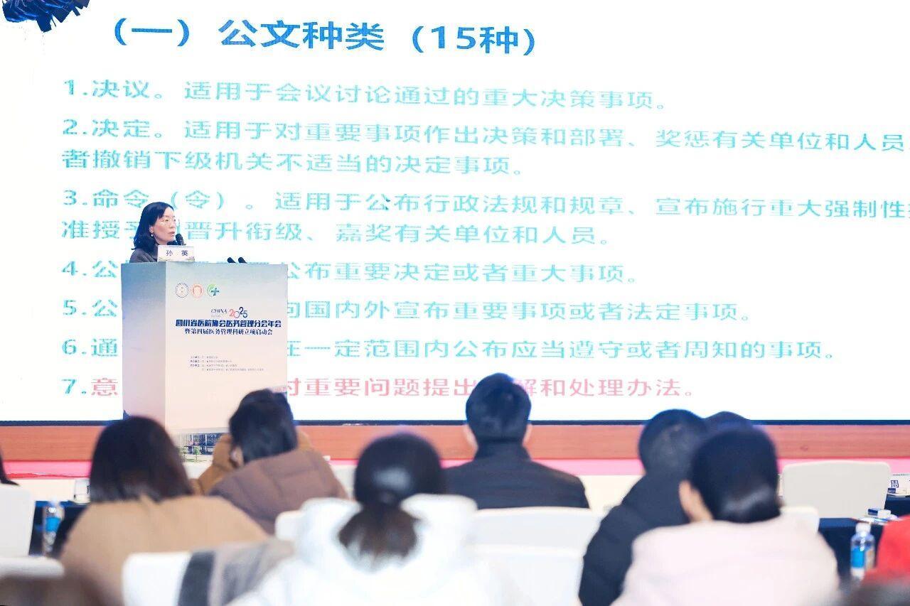 与此同时,在“公文与信息化建设”专场,四川省卫健委办公室副主任孙英带来了公文撰写规范培训。四川省人民医院图书期刊部副主任韩亮讲解了医学成果报奖策略。来自重庆医科大学附属第二医院、宜宾市第二人民医院等机构的信息化专家,如阳文琳处长、周浩副主任,分享了智慧管理、信息化建设驱动医疗质量提升的实践路径。简阳市人民医院三星分院院长苟廷伟、四川省人民医院医务部董硕等,则聚焦县域医疗中心建设、四级手术管理流程优化等具体议题进行经验交流。