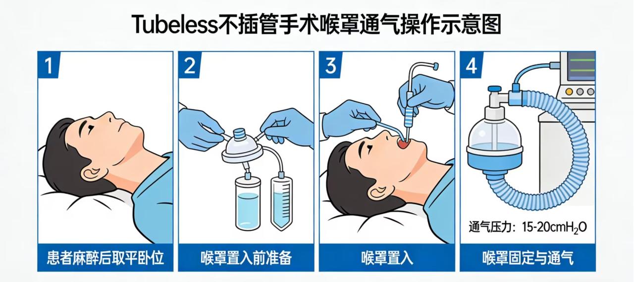 Tubeless(无管化)技术是胸外科领域的前沿革新,核心在于通过精准医疗手段减少或摒弃手术全程的各类管路束缚。手术中采用喉罩通气替代传统气管插管,保留患者自主呼吸且无需使用肌松药,配合超声引导下胸椎旁神经阻滞等多模式镇痛,从源头降低气道损伤与术后疼痛。同时实现术前不留置导尿管、术后不放置胸腔引流管的“无管化管理”,彻底告别传统手术“浑身插管”的痛苦体验,极大减轻患者生理创伤与心理负担。