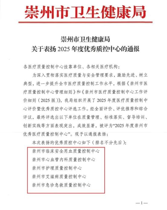 近日,崇州市卫生健康局组织开展了2025年度优秀医疗质量控制中心评选工作。经过全面、严格的综合评价,我院五个医疗质量控制中心凭借扎实的工作、规范的管理和显著的成效,在全市评选中脱颖而出,荣获 “2025年度崇州市优秀医疗质量控制中心” 称号!这五个中心分别是:崇州市临床安全用血质量控制中心、崇州市心血管内科质量控制中心、崇州市护理质量控制中心、崇州市艾滋病质量控制中心、崇州市急诊急救质量控制中心。