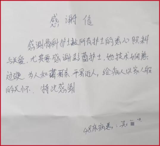 第二封感谢信,来自48床的患者。他因脚部骨折住院治疗,在信中表达了对骨科护理团队的认可与感谢。尤其让他感动的是规培护士彭蕾:“她技术娴熟,待人亲切,给病人以家人般的关怀。”字里行间,流露着被温柔以待的感动。