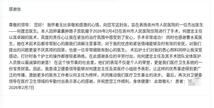 一封信,道出了一位患者的真实经历,也映射出一群普通医护工作者的日常。对于崇州市人民医院的医护工作者而言,患者的健康与安心始终是放在第一位的。正如他们自己所言,用专业守护生命,用服务传递温暖,是他们不变的坚持。